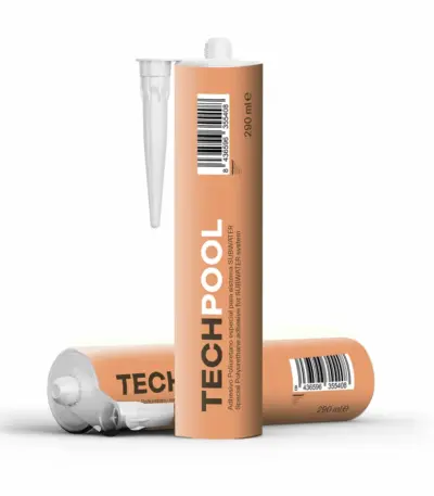 Adhesivo Poliuretano especial para sistema SUBWATER de Revestech de impermeabilización de piscinas. Sellador elástico adhesivo profesional desarrollado a partir de polímeros híbridos de última generación. TECHPOOL ofrece en un solo producto, combinar y mejorar las propiedades de las siliconas y los selladores de poliuretano actuales. Recomendado para sellado de encuentros entre accesorios de piscinas (focos, skimmers, tubos...) y la lámina de impermeabilización.